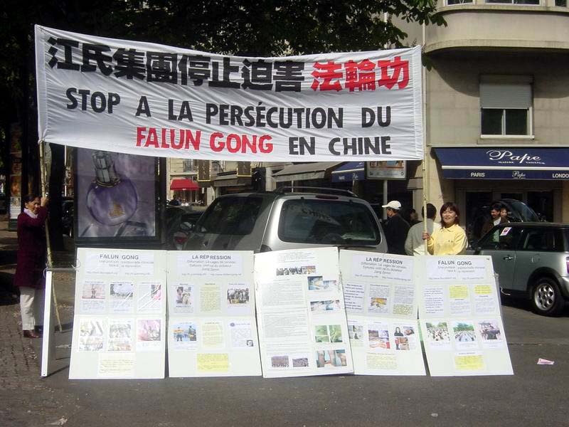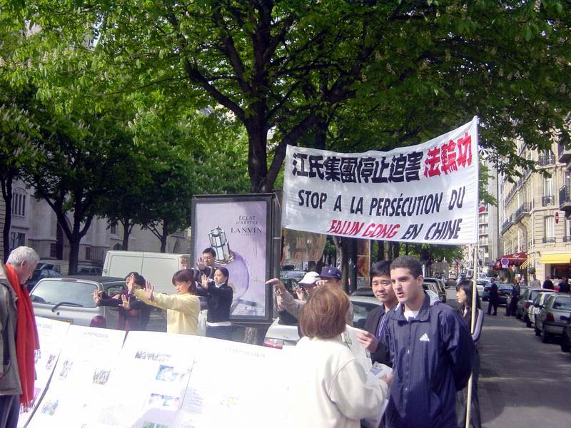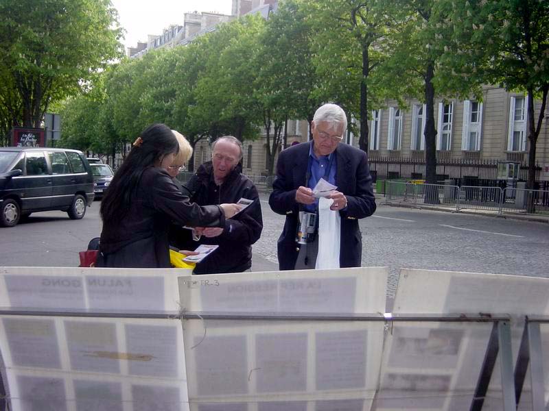在纪念的“4.25”活动中,法国学员在中使馆前静静的炼功,发正念,一些学员向行人发放资料并讲述六年前“4.25”的真象。法轮功学员的横幅和展板在中使馆门前显得格外醒目,吸引了许多过路人的驻足观看。一位法国著名航空运输公司的经理知道真象后说 :我们现在正在和中国做生意,我和中国外交部长的私人关系很好,我会想办法帮助你们。他还主动把他的名片留给了学员。有的人对法轮功很同情,对学员说,“加油啊 !”还有的人对功法很感兴趣,并询问具体学功地点和阅读书籍的方法。