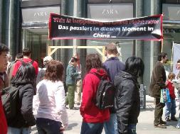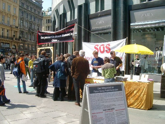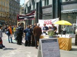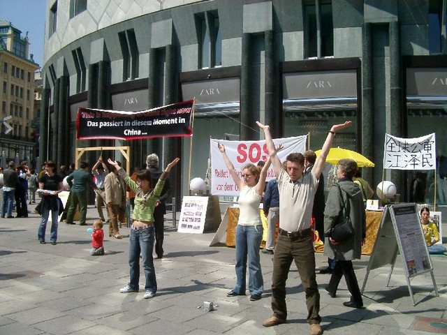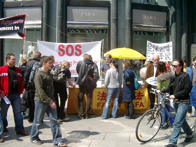 和过去的一周相比,这一天天气异常暖和,作为旅游胜地的史帝芬广场上挤满了各国的游客。法轮功学员准备了关于4.25和平上访的介绍和十几种语言的真象资料,大部份游客都能找到自己国家语言的资料。人们看到揭露迫害的模拟酷刑展时很震惊。许多人在听到真象后就问,他们怎样能对中国法轮功学员提供帮助,有没有请愿信可以签名。