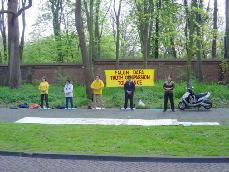 为了纪念99年4.25万人和平上访六周年,荷兰法轮功学员于2005年4月24日下午,在中使馆前和平请愿,呼吁停止迫害。