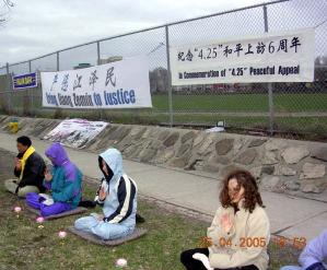 2005年4月25日傍晚,“4•25”中南海万名法轮功学员和平上访六周年之际,来自世界各地约千名法轮功学员和多个团体代表在纽约中领馆前集会,呼吁各界人士发出正义之声,制止中共对法轮功学员的迫害,并规劝中共党徒悬崖勒马,回头是岸,不要再作中共的行恶工具。