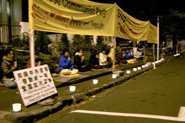 点点摇曳的烛光,似乎在诉说着六年来中国大陆法轮功学员所遭受的残酷迫害,默默打坐的学员,在无声中抗议中共的暴行,呼唤着人们的正义和良知。