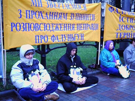 【明慧网2005年4月28日】2005年4月25日,乌克兰法轮功学员在乌克兰基辅市(Kiev)的中使馆前举行了静坐活动,纪念1999年