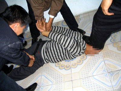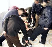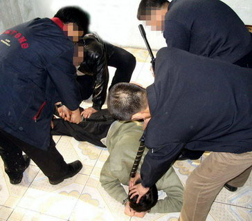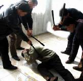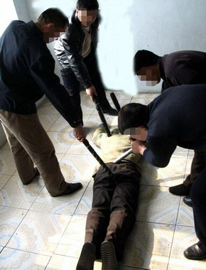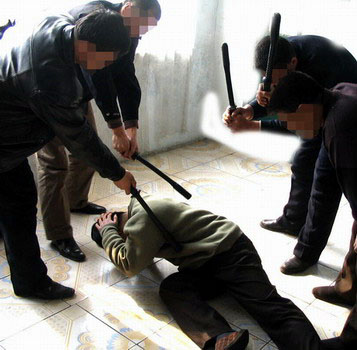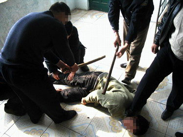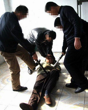 ![]() 酷刑演示图41:拽下棉裤用狼牙棒打 | ![]() 酷刑演示图42:四恶警毒打一人 |