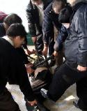 恶警梁大队长、韩晶中队长、恶警王雷、刘涛等十几个人把大法弟子按在地上,掀起上衣几根电棍一起电击,狼牙棒一起往身上打,边踢边电边打边骂:什么不识抬举,给脸不要脸等,这个过程持续十多分钟(图38、39)。特别是恶警王雷,邪恶至极,反复电击敏感部位,直到打累了为止。这次酷刑使遭受酷刑的大法弟子多少天自己都不能穿衣服。有一半以上的大法弟子被打被电,多人被打伤打残。舒兰36岁的大法弟子陈德喜也是因为在这一惨案中被打成内伤,得不到医治,后离开人世。后来恶警就开始强行给绝食的大法弟子用痰盂野蛮灌食(图40)。