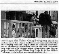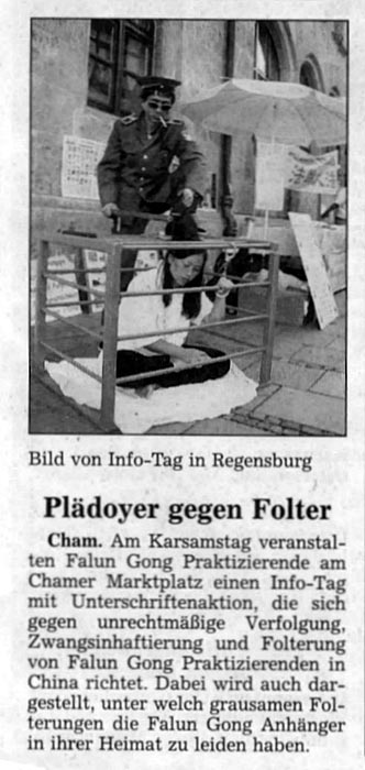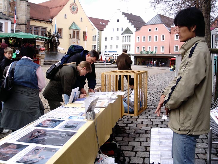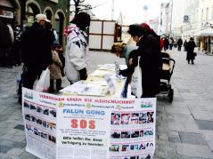 德国卡姆市学员继在当地连续开展洪法讲真象活动后,近来深感有义务,有条件到周边城市更广泛的传播法轮功真象。所以在三八妇女节来临之际,申请了在施特劳宾市的法轮大法信息日。在申请过程中虽然遇到了不小的干扰,学员们还是以正念正行在活动前一天获得了许可,同时当地报社也迅速将活动的预告刊登在第二天的报纸上,使读者们及时了解法轮大法信息日的主旨,并前来签名支持反迫害。