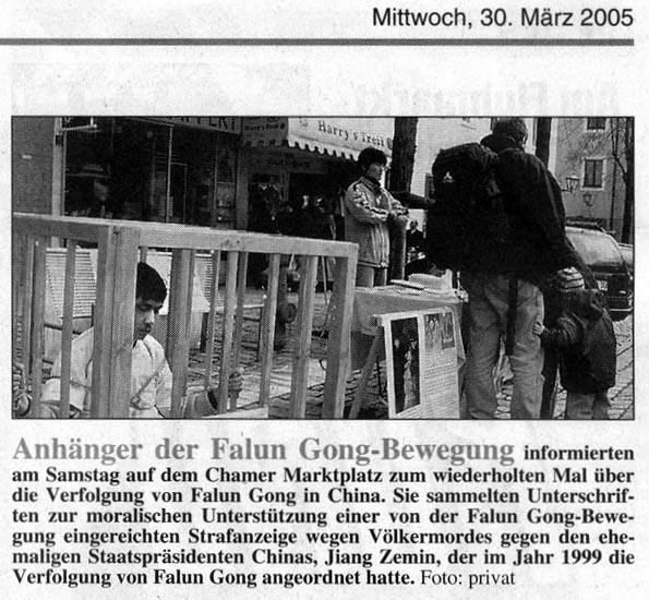 【明慧网2005年4月3日】经过了近两年来大大小小的洪法讲真象的活动,法轮功在德国巴伐利亚森林里的小城卡姆市(Cham)已经被当地的广大民众所了解。为了能使更多的有缘人走近大法,卡姆市的学员决定与当地民校联系举办法轮功九天讲法录像班。民校校长欣然接受法轮功学员开九天班的请求,免费提供教室和设备,并主动和学员们沟通协调开班的准备事项。之后当地的四个报社及周边报社都刊登了法轮功九天班的介绍,其中一家报社以头版消息刊登法轮功九天班的消息及美国医学博士对法轮功的研究论文,也使法轮功成为了一时间的热门话题。所以原定的教室因报名人数比预期的多得多,校长又重新安排了大教室。