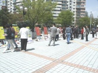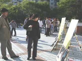 星期五在阳川区厅,有慰问残疾人的活动。法轮功学员们也在此集体炼功,旁边摆放着揭露大陆法轮功学员受迫害的照片,这些与真善忍国际美术展溶为一体。一名少年在看完画展后感觉非常好,第二天领着朋友来参观。有的孩子看了真象画作,非常悲伤,没来得及看完,就哭着回去了。还有一名看过展出的女士说,她的女儿是中学三年级学生,她知道法轮功是门祛病健身的好功法,偶然接到资料了解真象后,对她震动很大,并在学校里发表了禁止迫害人权的发言。