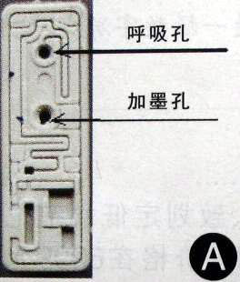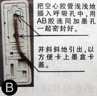 取出打印机的黑色墨盒(墨水已用完),将墨盒上端的商标纸撕掉,就能见到顶端有两个小孔(示意图A),有沟槽连到孔边的是墨盒呼吸孔,另一个是加墨孔。把空心胶管浅浅的插入墨盒呼吸空中(示意图B),将AB胶各挤出一点在玻璃上,混匀后快速将呼吸孔和胶管的空隙密封好,并将墨盒中部的加墨孔也封死,胶水未凝固时,在墨盒的表面用手将胶管尽量压平,使它紧贴墨盒顶端,改装好以后装到打印机里时就不会顶住墨盒卡盖,两分钟后,胶水凝固,改装便完成了。