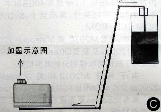 接下来是向墨盒加墨水了,将小胶管连到一个黑色墨水瓶中并插到墨水里,将墨盒底部的出墨孔朝上放好,把墨水瓶放到高处,此时墨水不会流向墨盒,用去了注射针头的针筒对准墨盒出墨孔抽气,墨水就会产生虹吸流沿着胶管流向墨盒,墨盒满时墨水会从出墨孔流出来,等墨盒出墨孔不再出现气泡时表示墨水加满了(示意图C)。