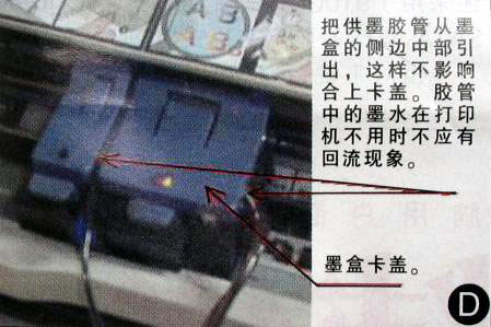 墨水加满后,将墨水瓶放到稍低于墨盒的位置,将墨盒擦干净,放入打印机中,把小胶管拔到不影响墨盒盖关闭的地方,关闭上墨盒盖,这样就算完成了黑色墨盒的改造了。有些较专业的连续供墨系统改装者,总是喜欢将墨盒卡盖拆掉,只用纸屑垫实墨盒或者使用铁夹固定,我认为这不是好方法,因为没有压力压住墨盒,墨盒出墨孔的位置会因为漏气而抽不上来墨水,造成供墨失败。