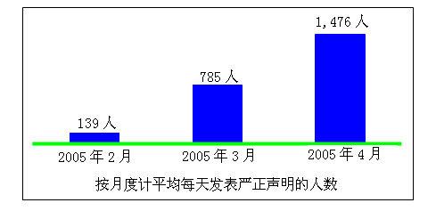 如果以自2005年2月至今,按照月度计,平均每天发表严正声明的人数分别为139、785及1476人: