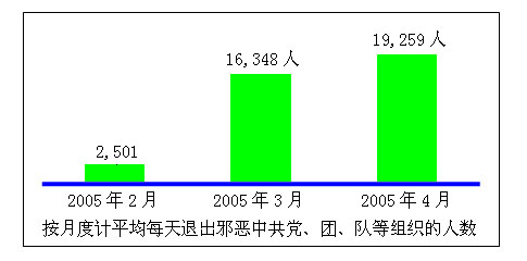 人们认清邪恶的本性,还可以从近来越来越多的人在国外网站上宣布退出中共党、团、队等组织得到印证。从2004年12月4日至2005年4月7日,已经有超过71万人退出,并且速度还在不断增长。自2005年2月至今以月度计,平均每天宣布退出的人数分别为2,501、16,348及19,259人。