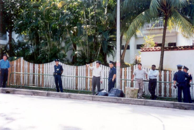 图3:这是当时15名新加坡法轮功学员请愿的中国大使馆旧址,多名警察在使馆围墙外监视法轮功学员