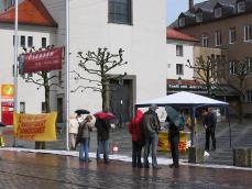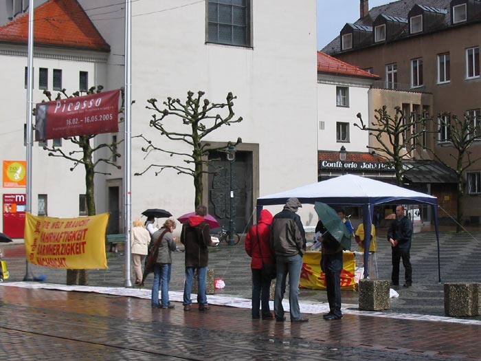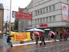 【明慧网2005年5月11日】2005年5月7日,德国南部城市奥格斯堡的法轮功学员冒雨在市中心举办了洪法讲真象活动,以图片、演示功法、发传单资料和征集签名等方式向当地民众展示法轮大法的美好,揭露在中国发生的对法轮功的残酷迫害
