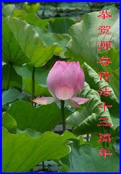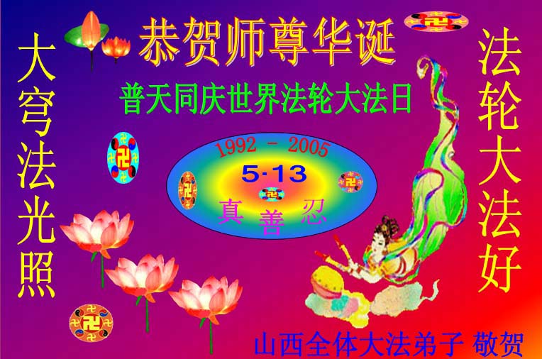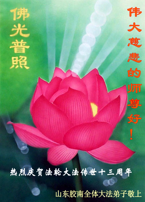 在喜庆2005年5月13日世界法轮大法日到来之际,山东省莱州市全体大法弟子恭贺慈悲伟大的师尊传法十三周年!向师尊致以最崇高的敬意,感谢师尊的慈悲苦度!