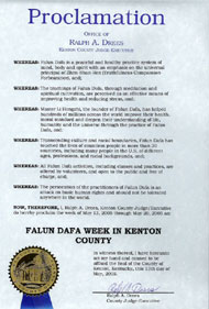 褒奖公告肯顿郡首席长官Ralph A. Drees办公室鉴于,法轮大法是一套和平健康的身心修炼系统,重在修炼宇宙原理真、善、忍,而且; 鉴于,法轮大法的法理,通过静坐和精神修炼的方式,被视为是一种改善健康及缓解压力的有效方法,而且; 鉴于,法轮大法的创始人李洪志大师帮助全世界数以千万计的人们通过修炼法轮大法从而改善健康,提升道德水准,加深对生活、人性和宇宙的理解,而且; 鉴于,法轮大法超越文化和种族的界限,触及到超过30多个国家中无数不同年龄、职业和种族背景的人们的生活,包括许多美国人,而且; 鉴于,法轮大法的所有活动包括讲座和炼功都由志愿者提供,面向大众,费用全免,而且; 鉴于,对法轮大法学员的迫害是对基本人权的践踏,是不能被世界任何地方所容忍的。