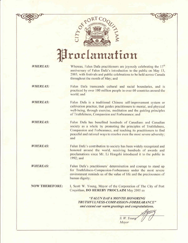 鉴于,法轮大法真善忍法理使上千的加拿大人受益也使加拿大整个社会受益,并教导学员用和平理性的方式去面对即使是最严酷的逆境;