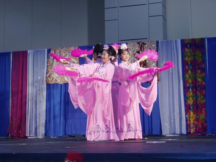 展览大厅的舞台上,各国移民轮流演出了其精心编排的文艺节目。14岁的法轮功小弟子为大家表演了琵琶,观众们连连点头,说太美了,美在内心。下午,几位法轮功学员又上台表演了传统的扇子舞,别的中国摊位的同胞专门跑到法轮功学员摊位来说:你们表演得太好了,真正的代表了我们中国文化。