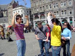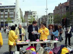 【明慧网二零零五年五月十四日】2005年5月13日,荷兰大法弟子在阿姆斯特丹的水坝广场(Dam Square)庆祝第六届世界法轮大法日。这一天风和日丽,游客众多,很多人了解了大法在全世界的洪传和在中国被