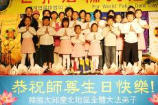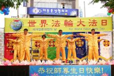 【明慧网2005年5月16日】2005年5月13日, 韩国大邱(Daegu)庆北地区法轮功学员举办了盛大的活动,庆祝世界法轮大法日,并恭祝师尊生日快乐。