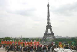 2005年5月15日,法国大法弟子来到与埃菲尔铁塔隔河相望的Trocadero广场,与全世界78个国家的大法弟子共同祝慈悲伟大的师父生日快乐、欢庆法轮大法在世间洪传13周年。