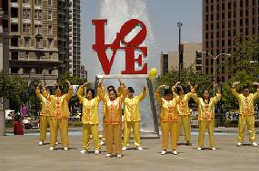 2005年5月13日中午,美国大费城地区法轮功学员在费城市政大楼附近的“爱心公园”举办庆祝世界法轮大法日活动,有功法演示、义务教功、书法等,吸引了过往行人的注目。