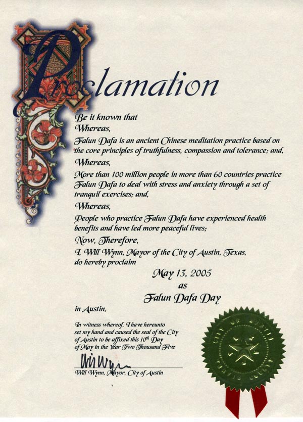 美国德克萨斯州奥斯汀市市长宣布“法轮大法日”