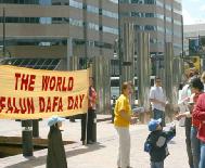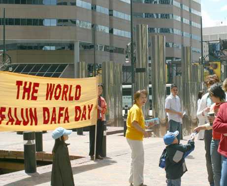 【明慧网2005年5月17日】2005年5月13日,美国科罗拉多州法轮功学员在丹佛市中心举行法轮大法日庆祝活动。新闻发布会后,学员们演示了功法,并向行人发放真象资料,并在同一地点的画廊里举办为期一周的真善忍画展。
