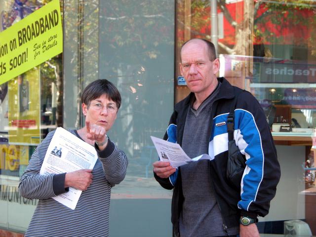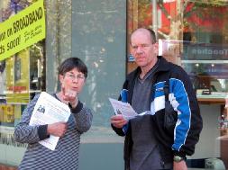 一名西人女士(非法轮功学员)向市民介绍法轮功学员在中国受迫害的情况