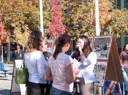 【明慧网2005年5月17日】2005年5月14日星期六,澳洲堪培拉学员在市中心以“法轮大法和平之旅”图片展的方式庆祝世界法轮大法日。两个彩色的遮阳亭,录像,给游客书写中文名字,赠送莲花,以及各种彩色图片,展板和横幅,让我们的展览显得格外引人注目。