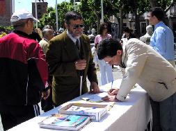 一位先生在看了受迫害图片后立即签名支持法轮功,并叫他的家人也来签名,因为广场上人很多,一时找不到他的家人,便着急的借来学员的扩音器呼叫:“爱莲娜,快到这里来签名支援法轮功!”他的呼叫又引来更多的人前来签名声援法轮功。