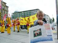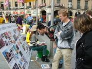 表演开场了,锣鼓喧天中“法轮大法好“的喊声让广场上的人深受感染,许多人认真的观看介绍法轮大法、大法洪传世界和介绍卍字符等的展板,不少人到展台前询问法轮功是什么、在哪里可以学炼,当他们得知这么好的功法在中国却受到残酷镇压,都感到不可思议,他们迫切想要了解中共为什么镇压法轮功,如何可以帮助中国的法轮功学员。