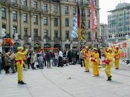 这是发生在2005年5月13日德国慕尼黑卡尔斯广场(Karlsplatz)的一幕,在世界法轮大法日来临之际,来自巴伐利亚州的法轮功学员举办了庆祝活动。当参加腰鼓表演的法轮功学员刚刚抵达广场时,就引来了无数好奇的目光,那对老夫妇更是围着学员问长问短,在得知表演还得等一段时间后,他们干脆在一旁找地方坐下,耐心的等待。