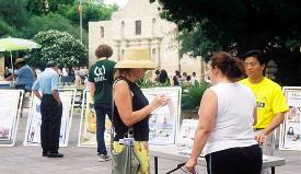 沿场地四周排列的真象展板向人们讲述了法轮大法的洪传,中共江氏集团在中国对法轮功的迫害,在海外对法轮功学员的骚扰,以及法轮功学员全球范围的反迫害和各界对法轮功的声援。