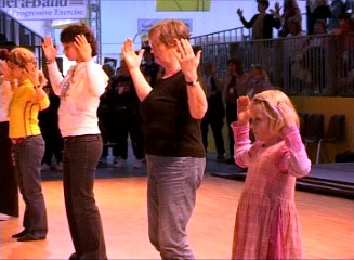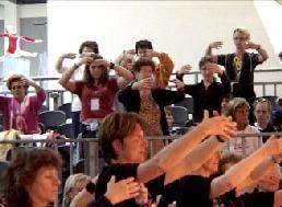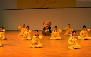 主持人瑞克那格先生的谈吐十分轻松、幽默,而且便于观众理解。他本人修炼法轮功多年,曾为呼吁制止迫害法轮功,到过天安门广场和平请愿。当他介绍法轮功的功法时,在座的许多观众不禁站起来,边看边学,时而高举,时而伸展的手臂,如同渴求光明的枝芽,密密的一大片。有些干脆跑到场上来,直接跟学员学。一位六、七岁,身着粉红色连衣裙的小女孩,稚气十足却有板有眼的跟着学炼了全套动功。最引人注目的是一只象征着柏林的吉祥物——“ 熊”,也情不自禁跑到台上,学着学员们的样子炼功。