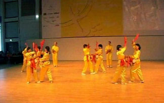 ![]() 小女孩稚气十足的跟着学炼了全套动功 | ![]() 柏林的吉祥物——“熊”跑到台上学炼功 |