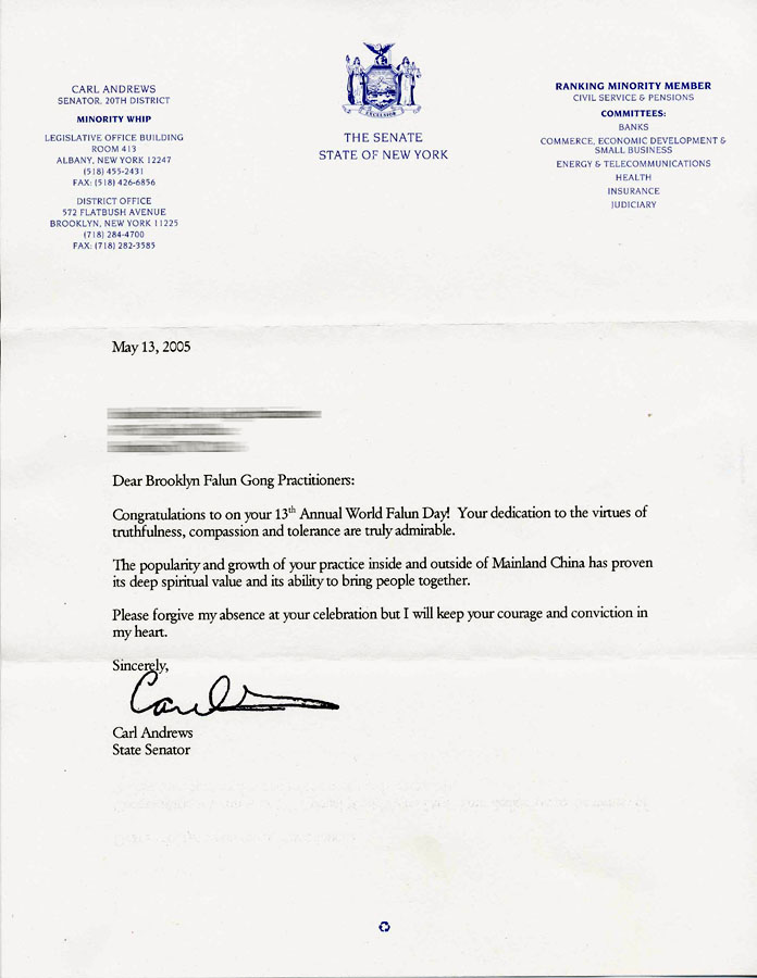 纽约州参议员卡•安竹给法轮大法日的贺信