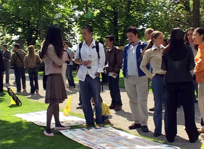 当日天气晴朗,在伯尔尼著名风景胜地玫瑰园的法轮大法信息摊位,周围飘扬的横幅及优美的功法展示构成了一道亮丽的风景线,吸引了众多来来往往的游人。他们纷纷接过了真象报纸, 还有很多人在营救一瑞士留学生在中国因修炼法轮功而被非法关押的母亲的征签表上签名表示支持。