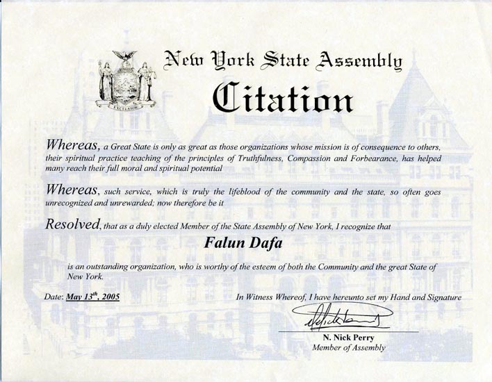 鉴于,一个伟大的州之所以伟大是因为她拥有那些组织,他们为了别人而奋斗,他们通过精神炼习教导真善忍的原则,帮助其他人达到道德和精神的升华。