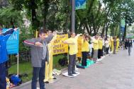 近百名乌克兰大法弟子在基辅市中心的中使馆前抗议中共集团在中国大陆针对法轮功的迫害