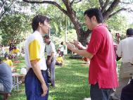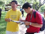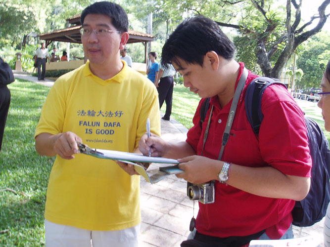 当到现场还未准备妥当之际,许多晨运者及休闲人士已经围上观看和想了解到底发生何事。学员们马上开始讲真象的工作,让这些以及陆续到来的人士了解真象,他们在明白真象后,纷纷在停止对法轮功迫害的征签簿上,各自写下了对良知和正义的抉择。有些在聆听真象的过程中红了眼眶。