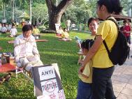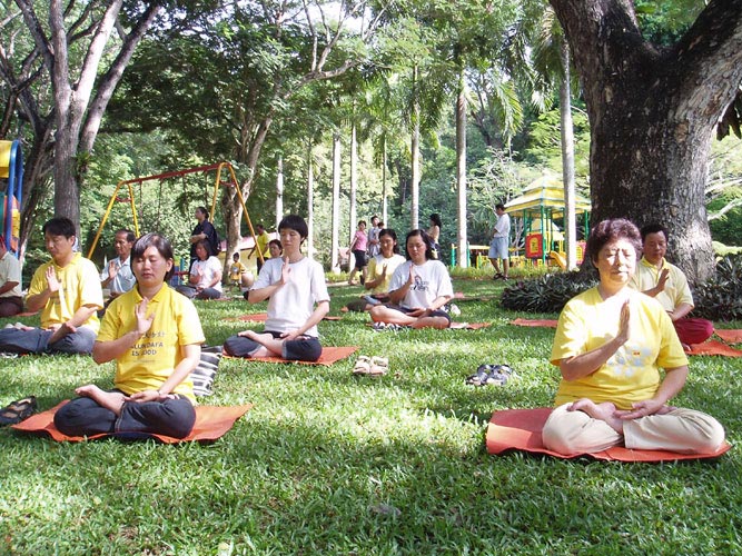 ![]() 反酷刑演示 | ![]() 记者采访 | ![]() 学员们集体炼功,发正念 |