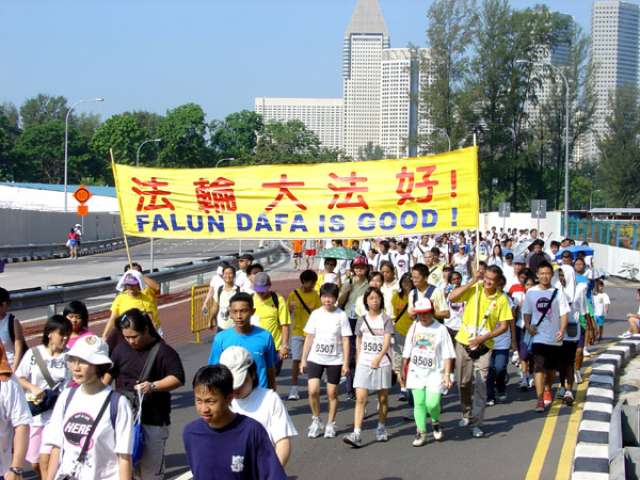 在这一天,新加坡法轮功学员意气风发的出现在浩浩荡荡的人流之中。他们身着黄衫,衣服上印着“法轮大法”或“真善忍”的中、英文字样,手擎大束彩色气球,高举着黄底红字的横幅,上写:“法轮大法好”、“法轮功使上亿人身心健康”、“法轮功传遍世界78个国家地区”。走在最前面的是法轮功学员的腰鼓队。几十名大法弟子英姿焕发,鼓声响亮整齐,步伐有力坚定。大法弟子的队伍色彩绚丽、神采奕奕,分外引人注目。好几位摄影记者一会儿站到高处、一会儿又蹲下忙着抢镜头,还有路人为他们鼓掌加油。