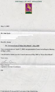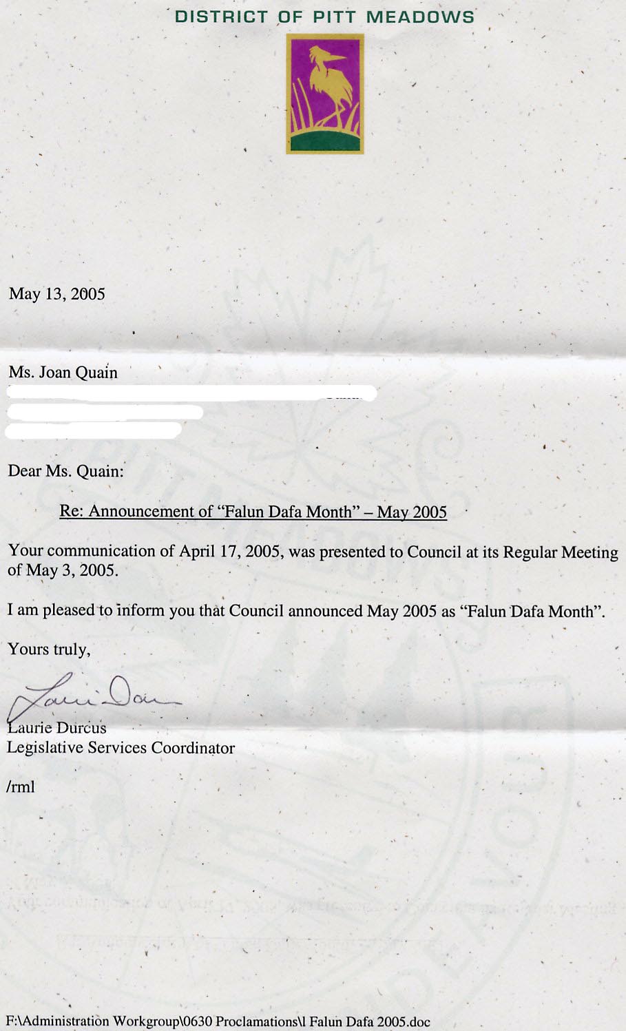 【明慧网2005年5月25日】2005年5月13日,加拿大不列颠哥伦比亚省Pitt Meadows区(district of Pitt Meadows)议会致信加拿大法轮大法协会,褒奖2005年5月为“法轮大法月”。