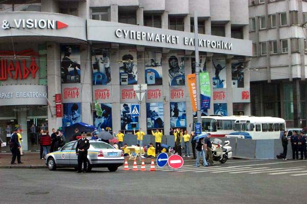 这样的游行对于基辅市民来说是独一无二的,吸引了很多的民众来观看并高兴的接受了法轮功真象传单。整个游行队伍从阿尔谢那勒广场出发。几分钟后游行队伍抵达驻基辅的中使馆。游行队伍停留在中使馆前约10分钟发正念。然后队伍继续前進。