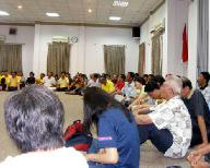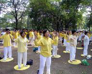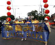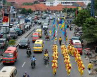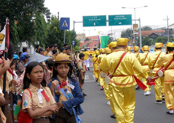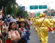 【明慧网2005年5月26日】为庆祝法轮大法洪传十三周年,来自印尼各地,包括棉兰,雅加达,三宝垄,Solo,Tulung Agung,Pasuruan,Sidoarjo,Probolinggo,泗水等地的法轮功学员,于2005年5月21-23日聚集泗水,举行盛大游行 ,集体炼功,以及心得交流会等系列活动。