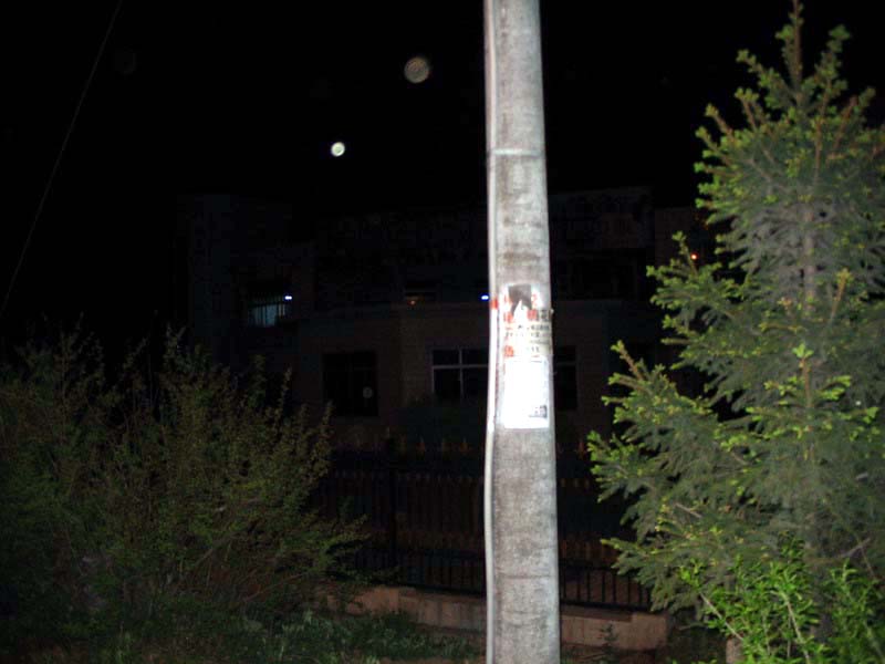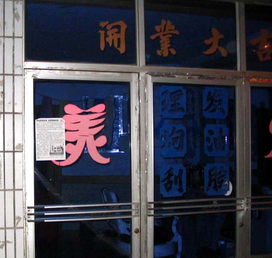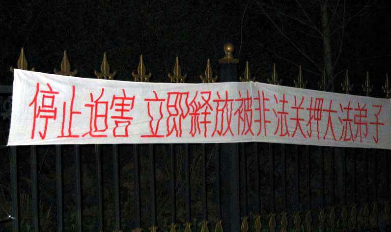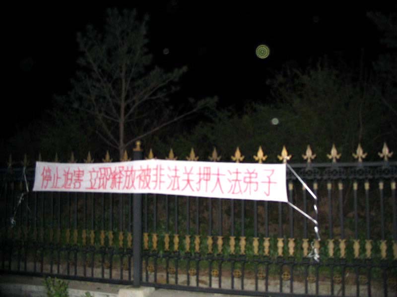 5月19日当晚,当地多名大法弟子共同配合,在洗脑班(春光乳业公司招待所)的正门上、在洗脑班附近的电线杆上、附近的公路上张贴了20来张揭露洗脑班恶行的不干胶——停止做恶 立即释放无辜;还有的大法弟子把一条4米多长的写有“停止迫害 立即释放被非法关押大法弟子”的横幅挂到了洗脑班外的铁栏杆上。当地其余不能赶到现场的大法弟子也和他们共同整体配合,一直在发正念加持。