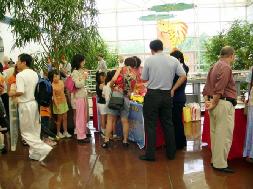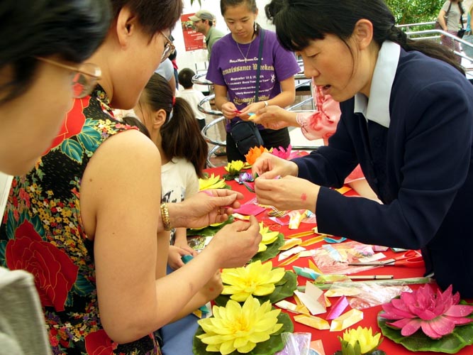 学做莲花的游客把法轮功学员的摊位挤得满满的,有时甚至有两三层人围那儿等着,孩子们索性挤進摊位里侧。一位筹委会工作人员几次过来帮助把人群拨开,让他们不要挡住挂在台前的法轮功旗,可是不一会儿人们又围上来了。4、5位学员一整天几乎没有离开摊位不停的一边教、一边述说着法轮功的真实故事,仍然应接不暇。两位西人学员想过来帮忙,不得不站在外围向人们讲真象。活动从早上10点开始到晚上5点结束,可是直到6点还有游客在听法轮功真象,和学做莲花。