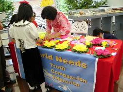 参加“中华文化日”的中国孩子来了一批又一批,他们被纯洁美丽的莲花深深吸引着,有几个孩子第一天来过后,第二天又来了。几位家长都说,他们的孩子就是喜欢来这里做莲花。法轮功学员一边教孩子们做莲花,一边告诉他们,莲花出淤泥而不染,法轮功教人按真善忍做好人,只要我们努力的去做,长大后就会象莲花一样,永远保持圣洁的心灵,就会有福份。孩子们听后都高兴的点头,有的还跟着说:“真、善、忍”。一个5,6岁模样的男孩,自己学会后还教他的妹妹,说:要说真话,做真人,对别人要好,别人对你不好时也不要记恨人家。说得在场的人都笑了。他那纯洁幼小的心灵已经铭记了“真、善、忍”三个字。