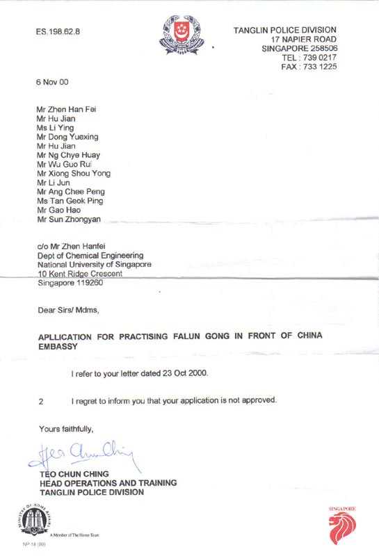 2000年10月23日,13名新加坡法轮功学员向唐陵警署(Tangling Police Division)申请在中国驻新加坡大使馆前炼功,以和平方式呼吁中国政府停止对法轮功的残酷迫害。